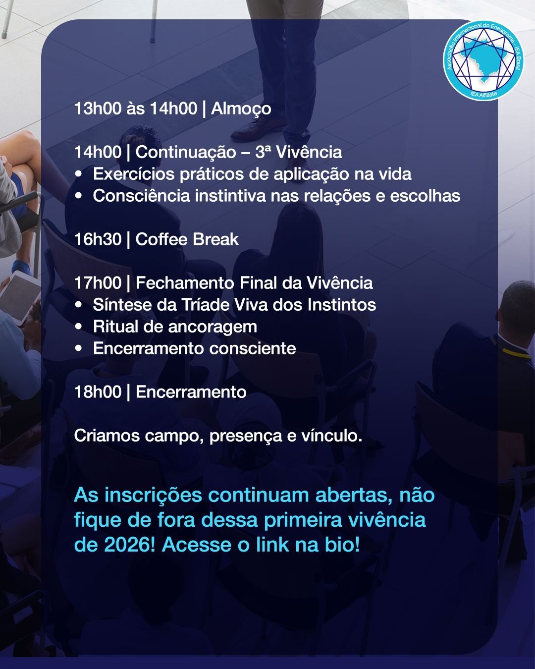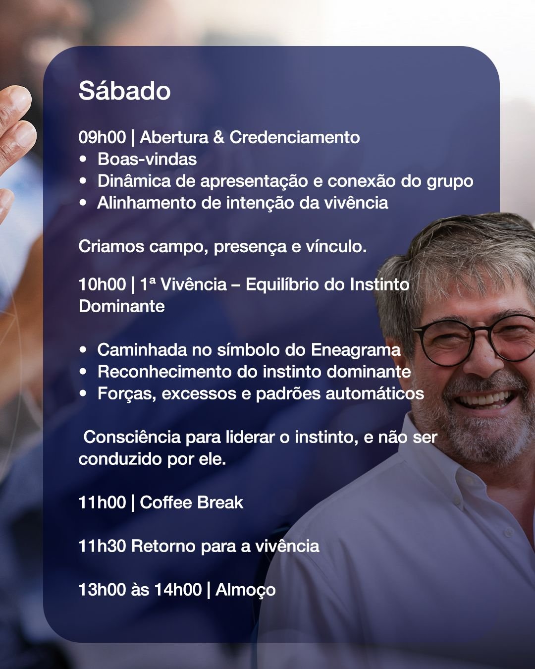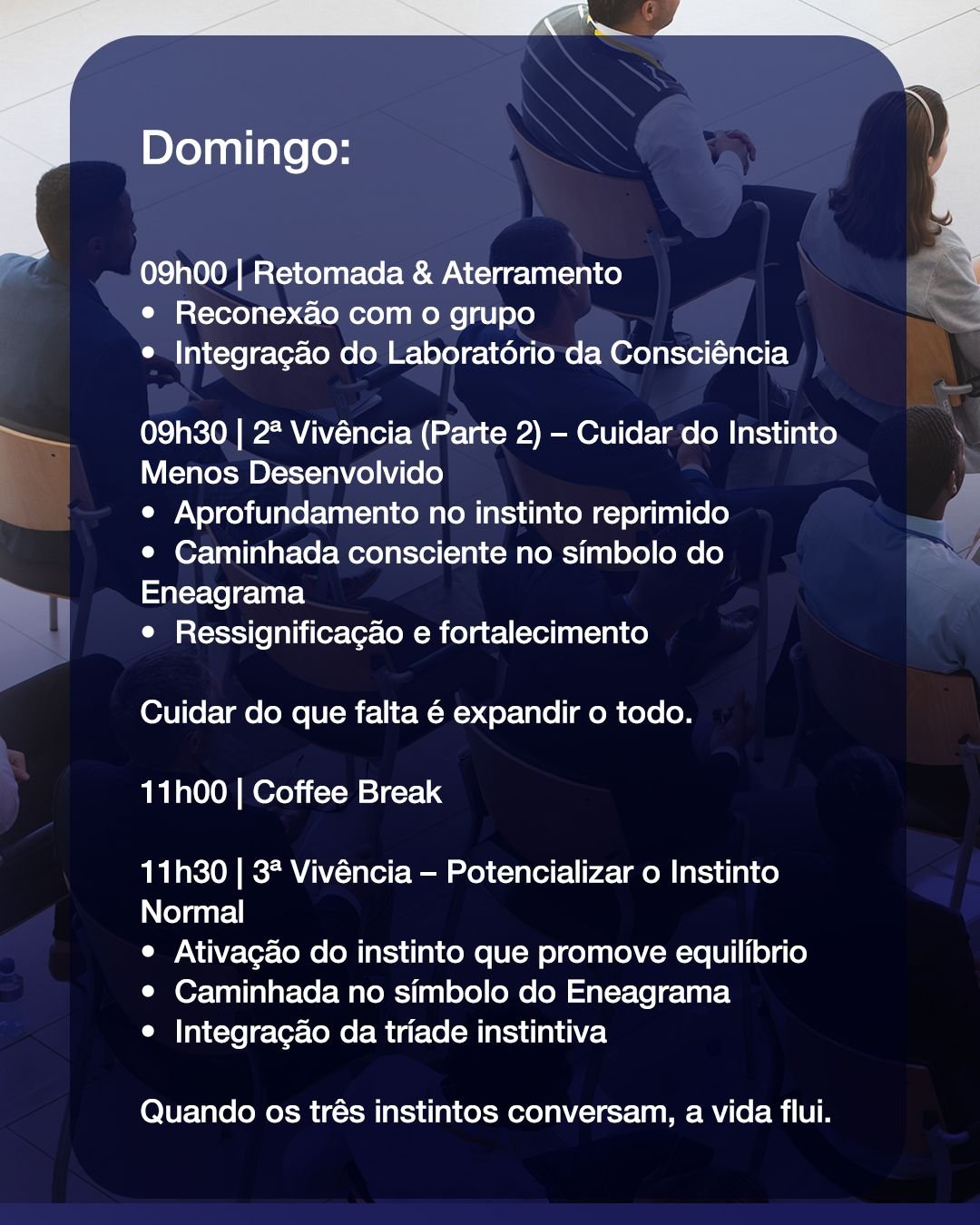 Durante esses dois dias, exploraremos os três instintos fundamentais, guiados pela simbologia do Eneagrama: